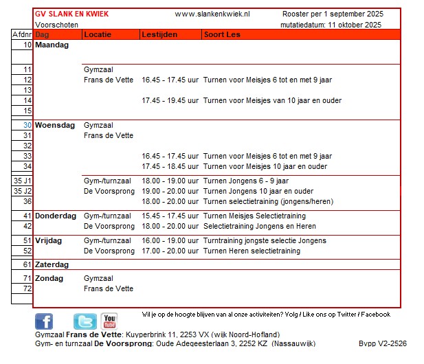 Hieronder vind je het lesrooster van alle lessen van Slank en Kwiek per 1 september 2025. Het lesrooster is ook te downloaden. Klik hier